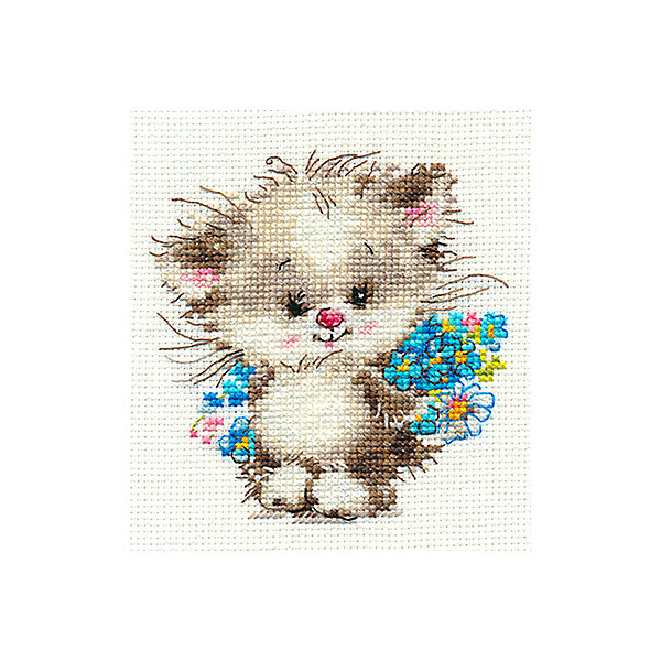 Небольшой формат хорошо подходит как для начинающих, так и для уже имеющих опыт в вышивке рукодельниц. На картине изображен серый котенок, держащий в лапах охапку цветов.