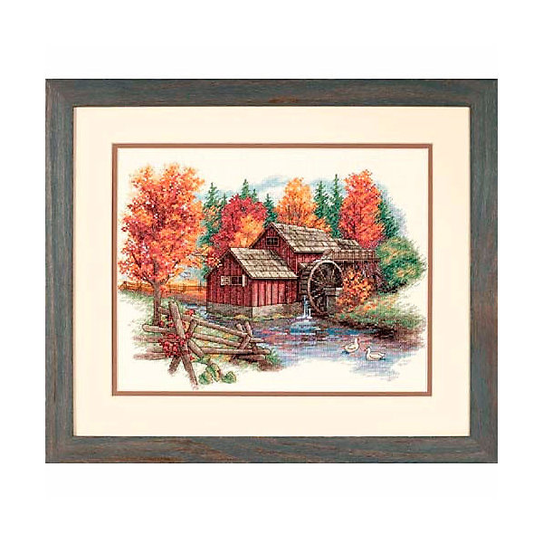На картине с осенним пейзажем изображен мельничий дом на берегу реки, где плавают птицы. Мельница как символ имеет особое значение для рукодельниц: считается, что такая вышивка приносит в дом богатство и плодородие, а пара лебедей на переднем плане сулит любовь и благополучие.