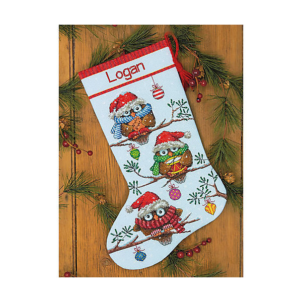 С помощью предложенного набора рукодельница сможет вышить декоративный носок для украшения интерьера к зимним праздникам. Разноцветные совы в зимних шапках и шарфах поднимут настроение. Верх работы можно оформить именем того, кому будут адресованы подарки.