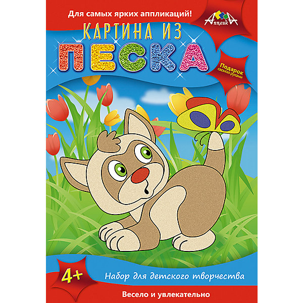 Набор для творчества позволит ребенку создать своими руками картину из пайеток с изображением колибри, картину из песка с изображением забавного котенка и открытку с изображением одуванчика.