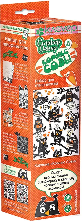 Предлагаем подросткам создать прикольную историю о семейке сов с помощью набора «Комикс. Совы»: готовые детали из виниловой чёрной плёнки отделяются от основы и наклеиваются на белый пластик, ориентируясь по контурам на инструкции. Оживят картинку и придадут ей оригинальность цветные элементы рисунка и спич-баблы (от англ. speech bubble «облачко с текстом в комиксах»).