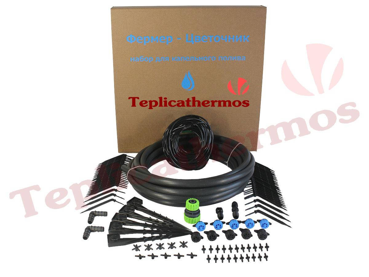 Набор для капельного полива “Фермер-Цветочник” предназначен для полива любых растений, но чаще всего его используют для полива, подкормки и внесения жидких удобрений декоративных растений, цветочных клумб, зимних садов и балконных вазонов. Набор «Фермер-Цветочник” больше предназначен для полива и подкормки не прямых рядов с равной периодичностью посадки растений, а любым неравномерным расположением цветов кустарников и т. д. Полив можно осуществлять с любой емкости или централизованного водоснабжения. Набор предназначен для подключения ¾ дюймовой поливочной шланге.