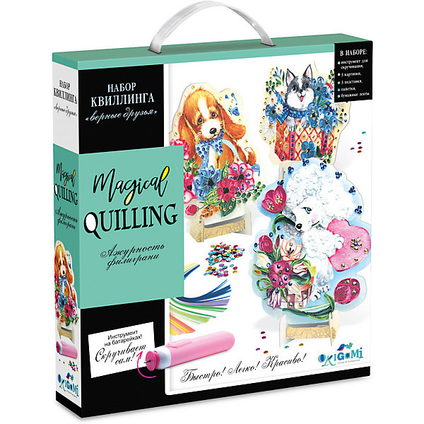 • в комплекте: инструмент для скручивания на батарейках, 3 картинки, 3 подставки, пайетки (3 цвета по 50 штук), бумажные ленты для квиллинга (8 цветов, 160 штук);