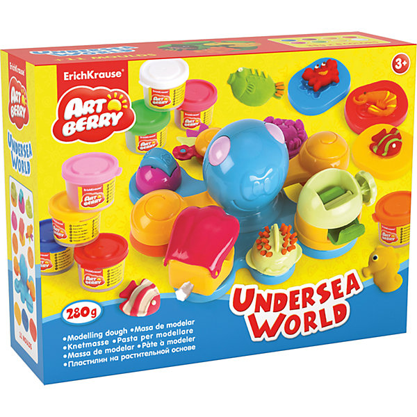 • в комплект входит: 8 цветов пластилина по 35 г + осьминог - игрушка, 3 объемных формочки, фигурный нож, насадка-штамп, насадка-валик, насадка-рыбка, насадка-крабик, насадка-пресс