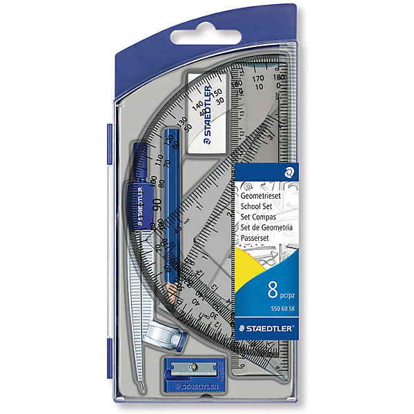 Набор для математики содержит 8 предметов. Циркуль с встроенным универсальным адаптером для карандаша отлично подойдет для первых занятий черчением в школе. Циркуль оснащен безопасной тупоугольной иглой, что повышает безопасность ребенка при работе с ним. Максимальный диаметр окружности прибл. 300 мм. Пластиковая точилка с металлическим лезвием обеспечит лёгкое равномерное затачивание карандашей (угол заточки 23°). Ластик гарантирует отличное стирание и минимальное количество крошек. Он изготовлен из термопластического синтетического каучука, гипоаллергенен. Также в наборе имеются чернографитовый карандаш, два треугольника, линейка(15 см), транспортир. Производитель Stadtler (Германия).