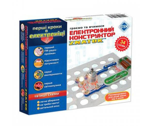 Электронный конструктор «Первые шаги в электронике (набор С)» даст возможность ребенку приобщиться к увлекательному миру электроники, получить базовые знания с этой отрасли науки, научится читать электронные схемы и собрать свои достаточно сложные электрические приборы. Сборка схем не требует пайки и основана на защелкивании металлических соединителей. Этот принцип позволяет неограниченное количество раз легко и безопасно собирать и разбирать схемы. Из деталей «Набора С» серии «Первые шаги в электронике» ребенок сможет собрать FM-радиоприемник, усилитель мощности, светомузыку, а также произвести свои интересные опыты. В комплекте с конструктором поставляется подробная инструкция на русском языке, в которой описывается построение 34-ох электрических схем, использующих базовые элементы электроники: электродвигатели, усилители мощности, радиоприемники, звуковые динамики, светодиоды, электролампы, резисторы и транзисторы, проводники, выключатели, элементы питания. Также пособие содержит теоретические объяснения, вопросы и задания.Электронный конструктор «Знаток» прошел апробацию в школах и других учебных учреждениях, и в результате получил высокую оценку специалистов.Для работы конструктора необходимы 2 батарейки типа АА (не входят в комплект).Наборы «А», «В» и «С» серии «Первые шаги в электронике» можно совмещать и дополнять друг другом.Рекомендуемый возраст ‒ от 5-ти лет.