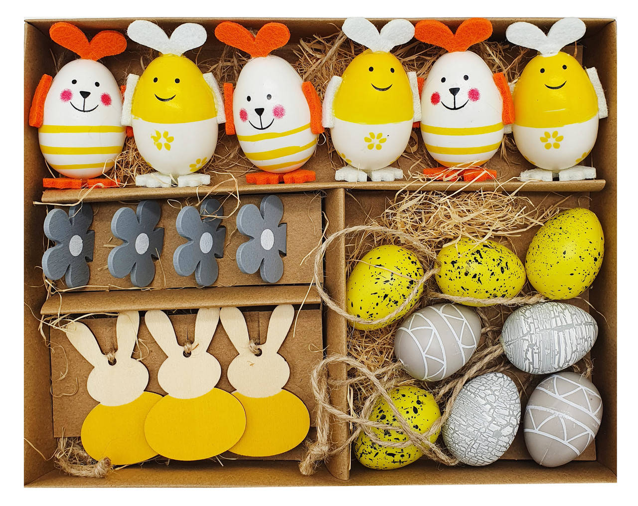 Для подвешивания: 8 узорчатых пасхальных яиц, 6 пасхальных яиц в виде кроликов, 3 деревянных кролика, 4 деревянных цветка.