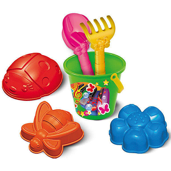 - В наборе: три формочки (бабочка,цветочек,божья коровка), лопатка, грабли, ведро среднее с печатью