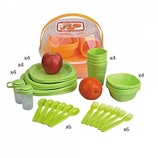 Характеристики: Тарелка большая под хлеб – 1 шт Тарелки большие обеденные – 4 шт Тарелки суповые глубокие – 4 шт Тарелки средние – 4 шт Тарелки маленькие – 4 шт Ложки – 4 шт Вилки – 4 шт Стаканы – 4 шт Емкость под специи – 2 шт Салатницы большие глубокое – 2 шт Ручка-зажим – 1 шт Материал – Пищевой пластик