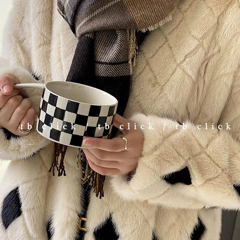 Шахматная кружка в стиле ретро с Красной сеткой, ручная роспись, черно-белая кружка для кофе с ручкой, керамическая кружка, миниатюрный дизайн