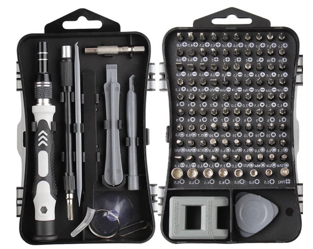 Универсальный набор отверток пригодится не только для хозяину, но и хозяйке. Удобный контейнер позволит хранить насадки в полном порядке. Теперь вам не придется хранить массу отверток, которые занимают место. 112 инструментов в одном наборе помогут справиться с любой поставленной задачей по ремонту телефонов, ноутбуков и различных предметов быта! В набор входит множество насадок разной конфигурации и диаметра, а также отвертка с удобной резино-пластмассовой ручкой и магнитным держателем насадок.