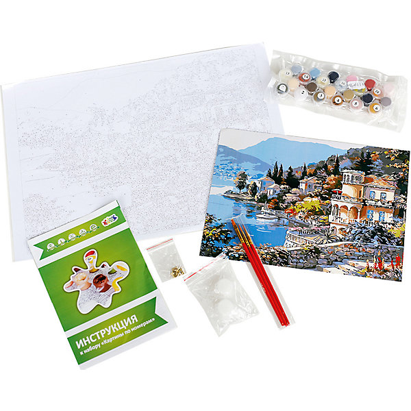 • в наборе: подарочная коробка, хлопковый холст на деревянном подрамнике с цветным контурным рисунком, краски акриловые в вакуумной упаковке, 3 кисти, чек-лист, чек-лист цветной, цветная книжка инструкция, лак в комплекте, крепление на стену