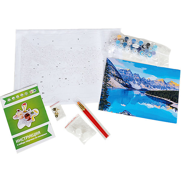 • в наборе: подарочная коробка, хлопковый холст на деревянном подрамнике с цветным контурным рисунком, краски акриловые в вакуумной упаковке, 3 кисти, чек-лист, чек-лист цветной, цветная книжка инструкция, лак в комплекте, крепление на стену