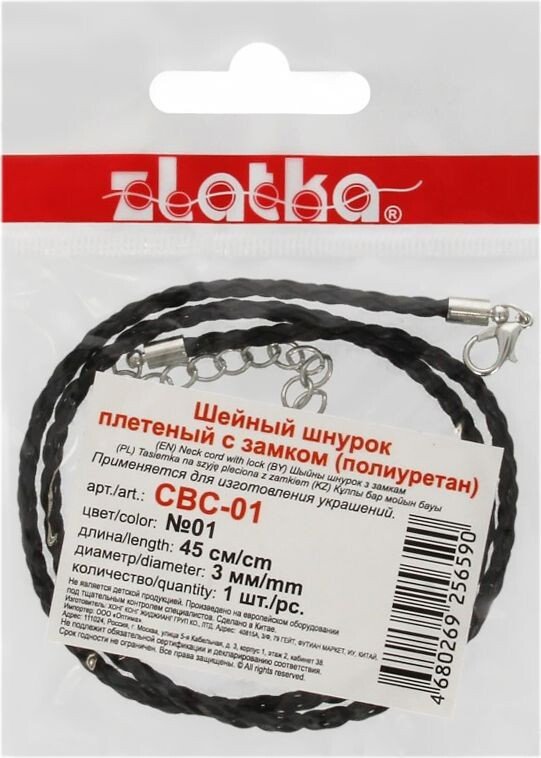 Набор для рукоделия Zlatka Шнур плетеный с замком CBC-01 45 см d 3 мм (№01 черный)