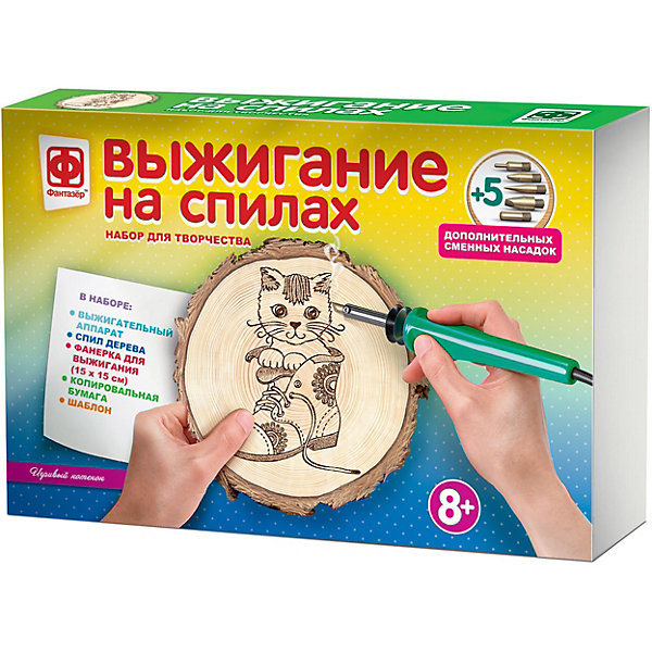 • в наборе: выжигательный аппарат с 6 сменными насадками, спил дерева, фанера для выжигания, шаблон, наждачная и копировальная бумага, инструкция