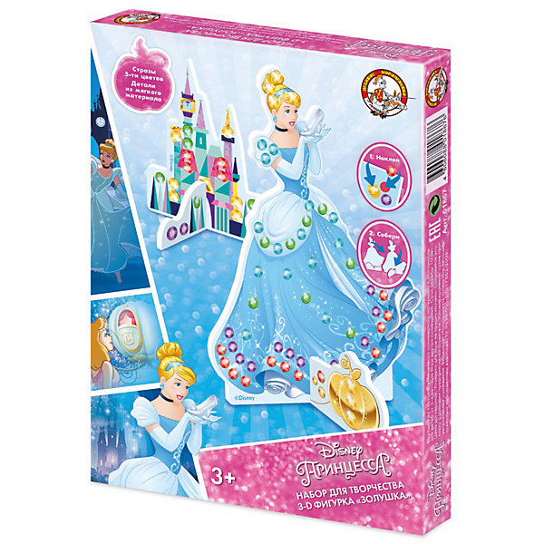 Набор для творчества включает в себя: заготовки из вспененного полимерного материала с изображением «Золушки» и сказочного замка; комплект страз 5 цветов.