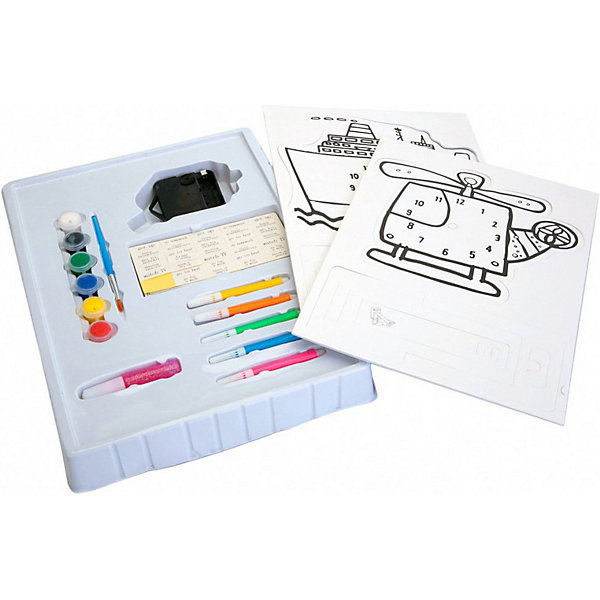 • в комплекте: 2 циферблата, 2 подставки, 5 мини-фломастеров, 1 кисточка, 6 красок гуашь, 1 блеск, 3 стрелки, 1 часовой механизм, 5 карточек с расписанием на английском языке