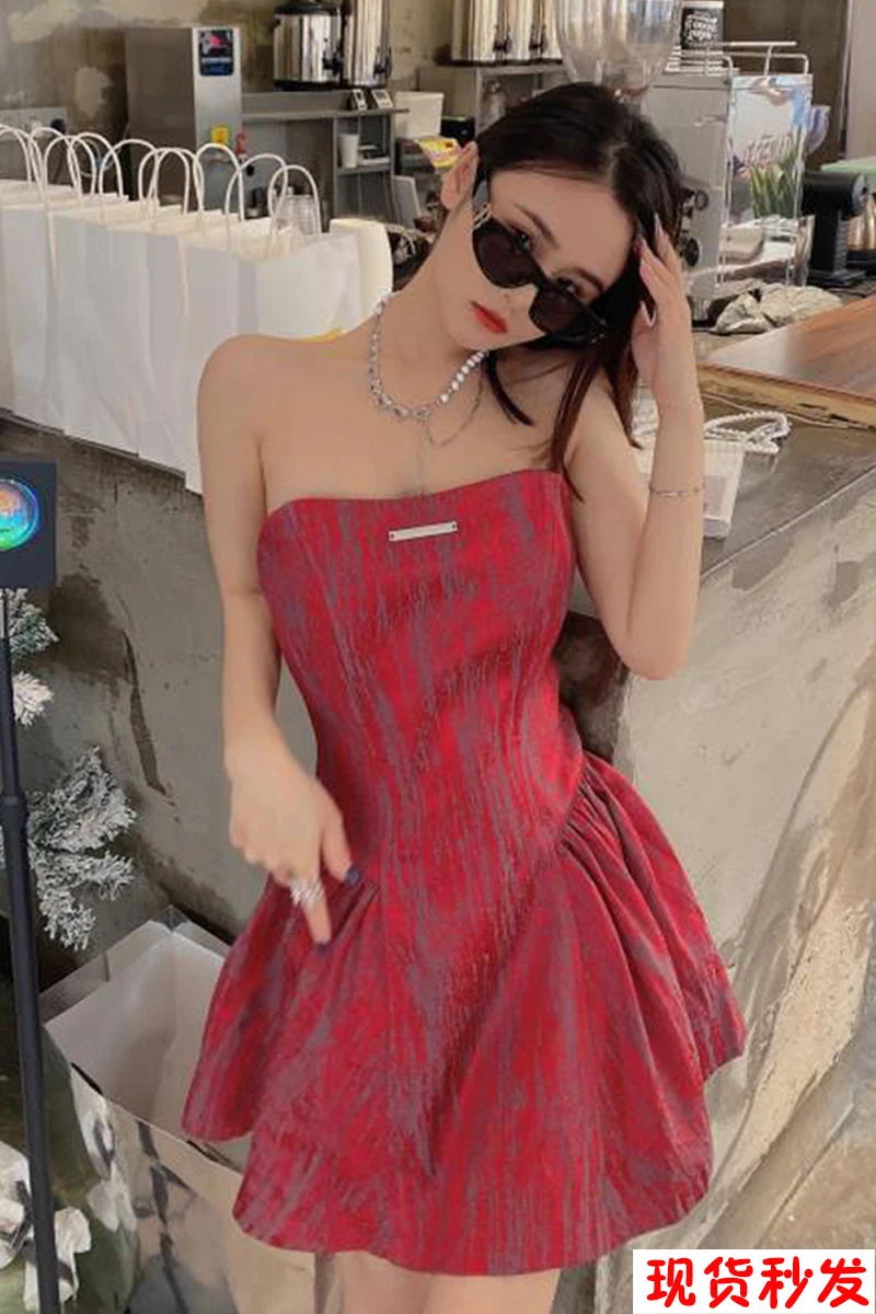 2021 Summer New French Red off-the-Shoulder Fitted Waist Pleated Slimming Stripes Dress Tube Dress Fairy
