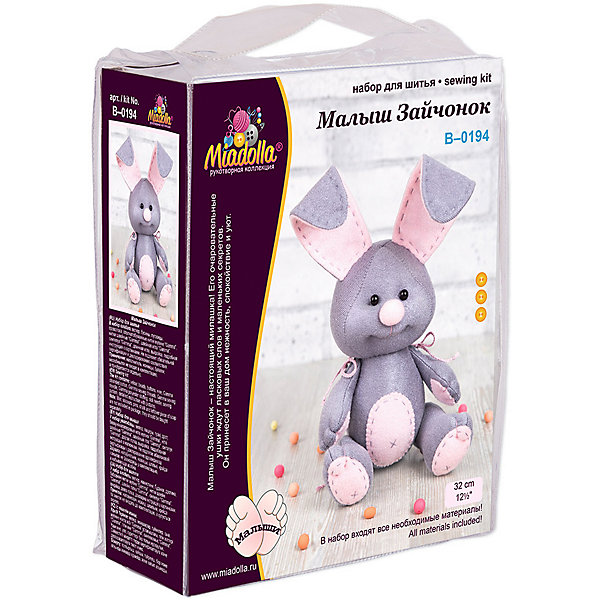 В наборе для изготовления игрушки Miadolla B-0194 «Малыш Зайчонок» есть все материалы для шитья от этапа заготовки. Готовая модель отличается мягкостью, может принимать сидячее положение. Внутри ушек предусмотрена проволока для их фиксации.