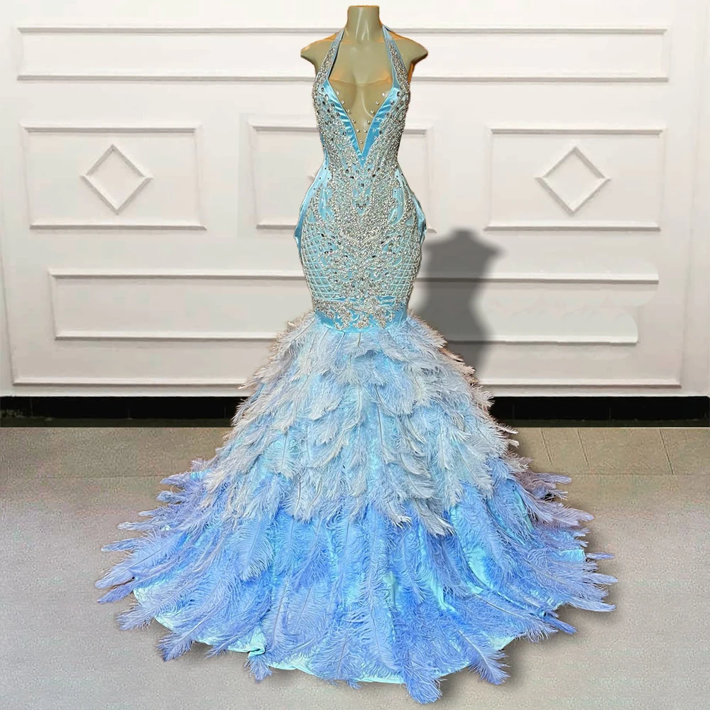 Женское длинное вечернее платье-русалка, роскошное черное платье с блестящими стразами и перьями для выпускного вечера, 2022