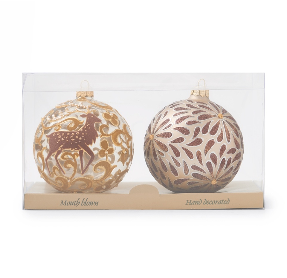 Набор игрушек для ёлки из коллекции «Праздник»: шар с изображением оленя и шар с цветочным декором, IRENA, 2 шт., 10 см, стекло, цвет: коричневый, Литва