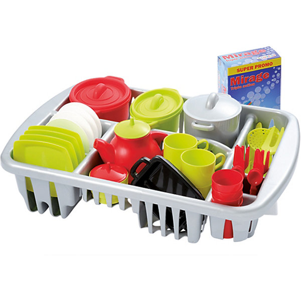 Набор состоит из 45 различных предметов посудки. Вся посудка размещается в сушилке. Можно приготовить вкусный обед и накрыть стол на несколько персон. Все предметы выполнены из безопасного пластика и окрашены в яркие цвета.