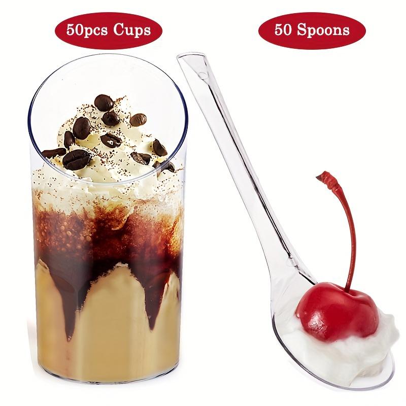 Набор из 100 десертных ложек (50 шт. Чашек + 50 шт. Ложек) с ложками маленькие пластиковые 3 унции наклонные круглые одноразовые прозрачные пластиковые стаканчики для закусок парфе 50pcs Cups+50pcs Spoons