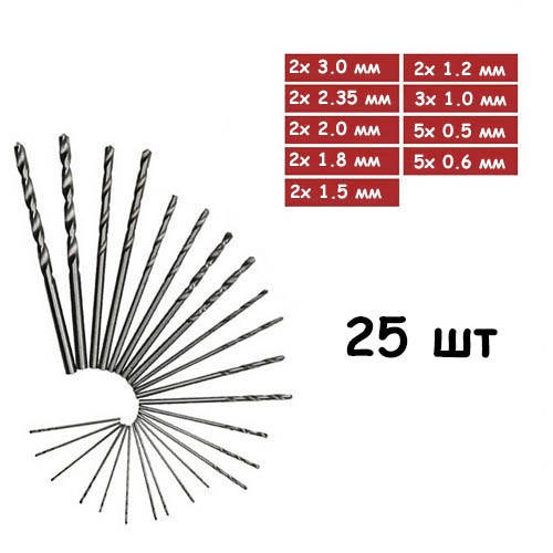 Набор из 25 сверл 0.5-3мм для ручной мини дрели, HSS-сталь