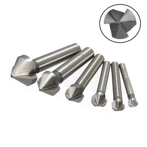 Набор из 6 металлорежущих инструментов с тремя режущими кромками. Предназначены для обработки предварительно просверленных отверстий, формирования опорных плоскостей возле отверстий, съема фаски в отверстиях и обработки отверстий под крепеж.