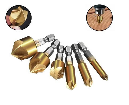 Набор из 6 сверл с зенковкой для обработки отверстий, снятия фасок, работ с пластиком, деревом, алюминием и другими не твердыми металлами.