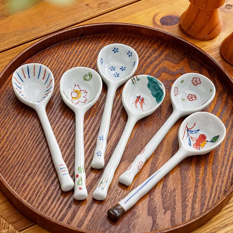 Набор из 6 штук Японская керамическая маленькая ложка, Бытовая ложка для перемешивания супа Ложка Милая Высокая цветовая ценность Инс Грубая керамика Суповая ложка