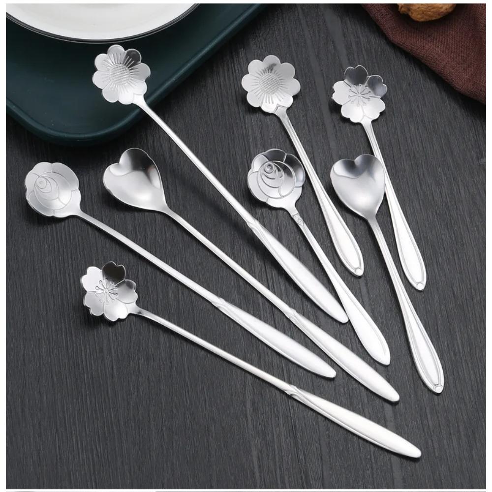 Набор из 8 чайных ложек с цветочным дизайном, маленькая кофейная ложка, милая ложка для мороженого и десерта, серебряная, золотая, из нержавеющей стали, для кофе, чая серебряный