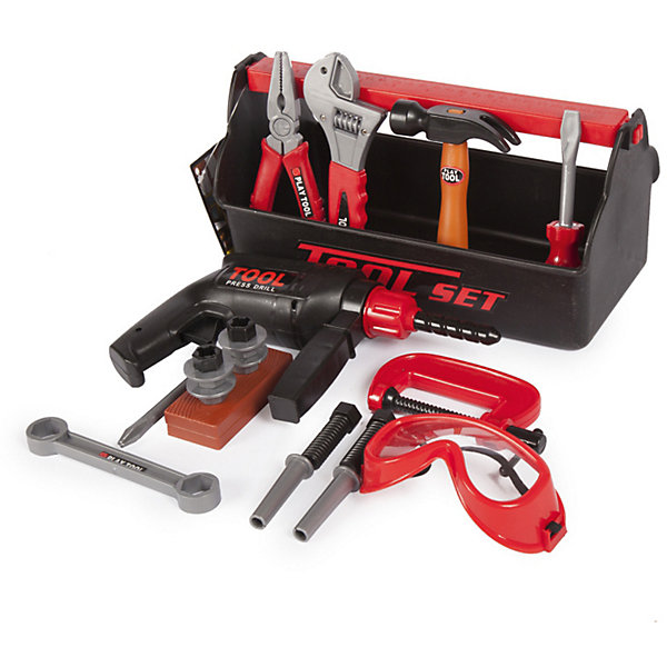 В наборе имеется все, что может пригодиться юному строителю: инерционная дрель с дополнительной рукояткой, разводной ключ, гаечный ключ, струбцина, молоток, отвертка, пассатижи, защитные очки, скобяные изделия. Все инструменты упакованы в пластиковый ящик, ручка которого одновременно является строительной линейкой.