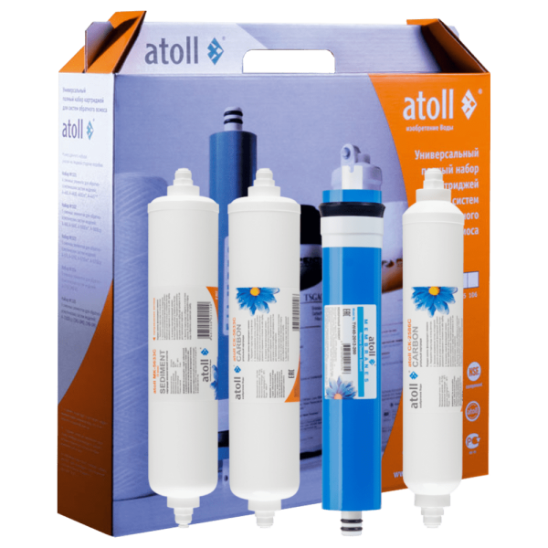 Набор картриджей atoll №114 STDA (для Slim А-4200). Состав набора: Префильтрация - быстросъемные картриджи стандарта in-line: механический atoll MK-5633C -5мкм и угольный Inline atoll CK-5633C. 1. Картридж atoll MK-5633C-5 мкм для механической очистки питьевой воды: Префильтр для компактных систем обратного осмоса. Фильтрующий слой из полипропилена. Цилиндрический корпус из пищевого пластика. Картриджи стандарта Inline с быстросъемными соединениями 1/4". Удаляет песок, грязь и др. твёрдые частицы размером более 5 микрон. Принимает первый удар грязи на себя. Уменьшает мутность и цветность фильтруемой воды. 2. Картридж Inline Atoll CK-5633C — сорбционный угольный картридж для очистки водопроводной воды, устанавливаемый в системы обратного осмоса atoll (компактные и корпусные). Поглощает загрязнения (механические и органические), хлор и запахи, обеспечивает нейтральный вкус отфильтрованной воды. Пропускная способность — 3.8 литра в минуту. Ресурс — 9 000 литров. После подлежит обязательной замене, но не реже одного раза в 6 месяцев. Особенности Inline Atoll CK-5633C: Срок замены: 6 месяцев. Используется, как префильтр перед полупроницаемой мембраной в системах обратного осмоса — устанавливается на вторую ступень очистки воды. В других случаях используется как постфильтр (для удаления посторонних запахов и привкусов) — в последней ступени очистки, монтируется перед питьевым краном. Имеет широкий диапазон рабочих температур — от +4°C до +38°C. 3. Мембрана нового поколения atoll TW40-2012-200 - долговечна, устойчива к воде с повышенной загрязненностью, имеет повышенную производительность 200GPD (до 750* л/сутки) и селективность 98,5%. Совместима с корпусом мембраны стандарта 1812. Рекомендуемый номинал ограничителя потока - DR800. Подходит для систем atoll Slim A-4200(m). *при солесодержании 250 мг/л и температуре входящей воды 15?C 4. Постфильтр - atoll CK-2586C — с угольным наполнителем и высоким ресурсом. Угольный постфильтр обеспечивает последнюю стадию очистки воды в системах Атолл. Его устанавливают для дополнительной очистки воды после обратноосмотической мембраны. Постфильтр atoll ck-2586c придает воде приятный вкус перед подачей в кран. Максимальная температура воды — 38 градусов.