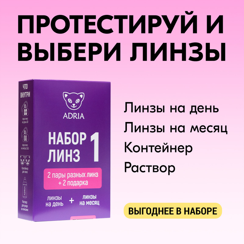 ADRIA Набор линз №1 (Tester BOX №1 ) - первый набор с линзами и бережным уходом за ними, с помощью которого вы сможете попробовать линзы ADRIA (Адрия). В составе: 1. Однодневные линзы для зрения с диоптриями ADRIA GO нового поколения. Преимущество: каждый день вы надеваете новую пару одноразовых гидрогелевых линз. Ежедневные линзы обеспечивают увлажнение на 12 часов. Режим ношения однодневные. В упаковке - 5 шт. 2. Ежемесячные силикон-гидрогелевые контактные линзы АDRIA O2O2 - 1 пара. Многоразовые на месяц. "Дышащие" линзы для зрения с диоптриями пропускают до 98% кислорода к глазу. 3. Универсальный раствор ADRIA для хранения и очистки 60 мл. Многофункциональная жидкость идеально подходит для борьбы с протеиновыми отложениями, оказывает противогрибковое действие. Подходит для чувствительных глаз. 4. Контейнер (футляр) для линз. Мягкие гидрогелевые и силикон-гидрогелевые линзы ADRIA (Адрия) созданы по технологии High Definition Vision. Уникальный дизайн передней поверхности контактной линзы обеспечивает повышенную контрастность и ясность зрения в любое время суток и при разном освещении, даже в сумерках.