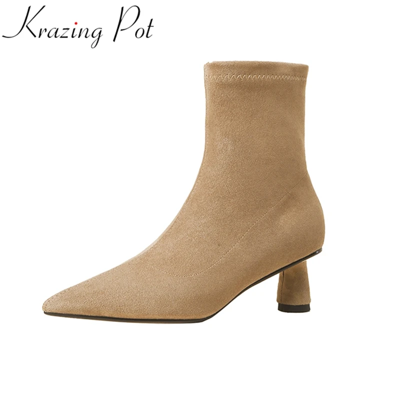 Krazing Pot Superstar Pointed Toe High Heel Slip On Stretch Boots Warm Size 40 Winter Shoes Concise Solid Elegant Ankle Boots
