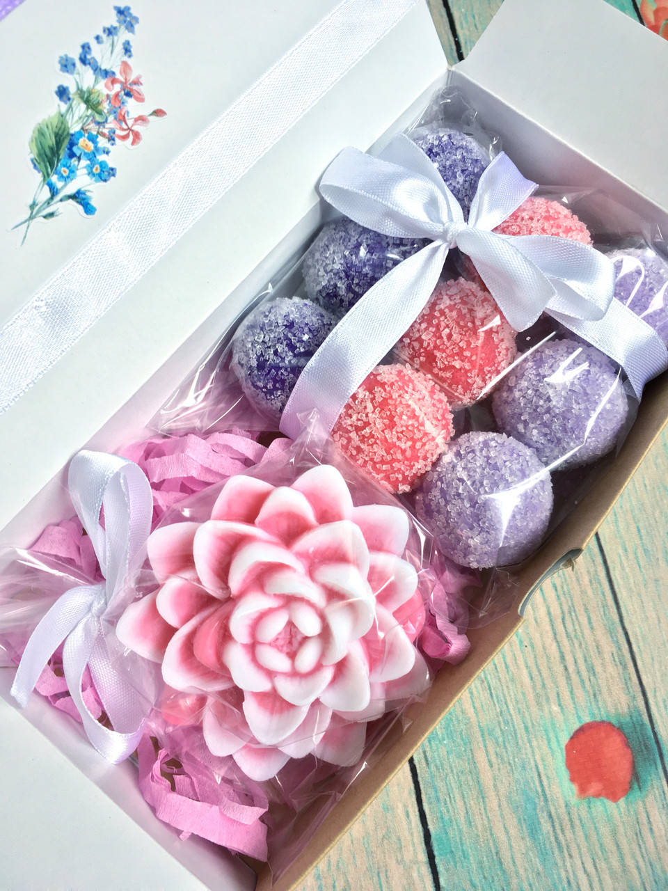 Коробка с мылом «Лотос» и 9 сахарными скрабами конфетками для тела.