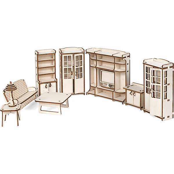 ∙ в наборе: сервант 117*60*35 мм, книжный шкаф 115*45*35 мм, диван 55*100*40 мм, тумбочка 47*55*35 мм, стенка под телевизор 118*112*35 мм, стол 35*40*40 мм, лампа 30*25*25 мм, журнальный стол 30*65*65 мм, телевизор 40*45*10 мм, наждачная бумага, клей ПВА, инструкция