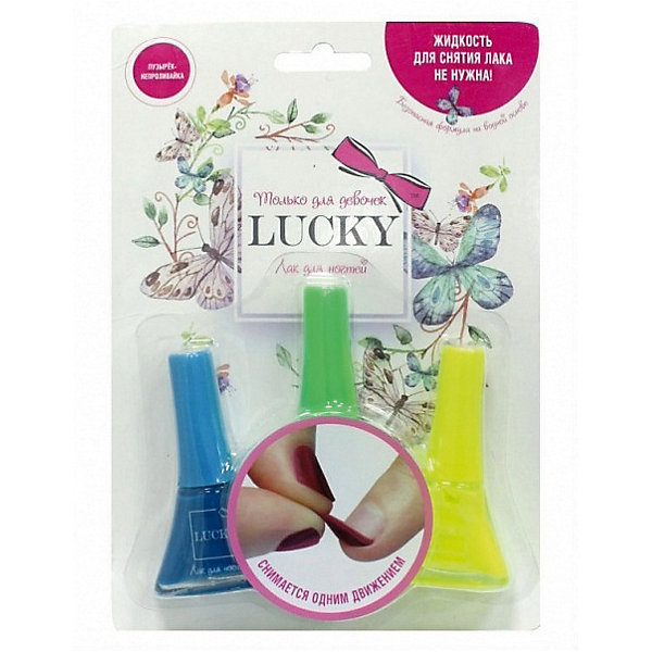 Набор лаков для ногтей Lucky предназначен для маленьких модниц, которые стремятся во всем походить на своих мам. Комплект включает в себя декоративную косметику трех цветов, которая обладает великолепными качествами: лаки ровным слоем ложатся на ногти ребенка, а их цвета полны насыщенности. Для того, чтобы сменить маникюр, девочке не нужно будет прибегать к использованию ацетона - средство имеет специальный состав, благодаря чему образует на ноготках пленку, которая легко снимается.