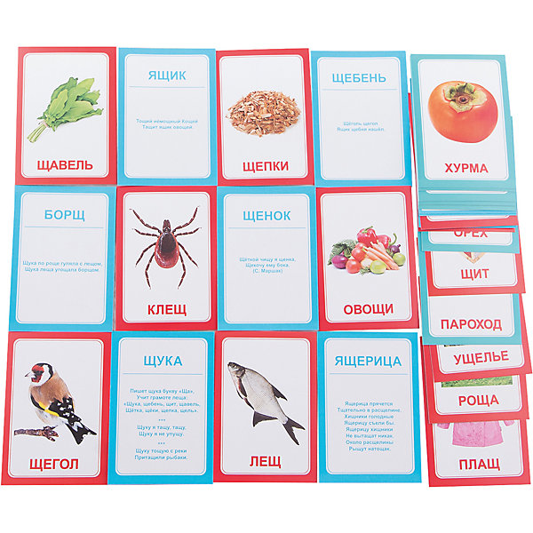 Набор Логопедка «Щ+Х» позволяет в игровой форме выучить весёлые четверостишья, получить массу положительных эмоций и зарядиться хорошим настроением на весь день. В комплект входят карточки с такими изображениями: щенок, щавель, щит, щегол, щука, ящик, ящерица, щебень, щепки, щётка, клещ, борщ, плащ, лещ, ущелье, роща, овощи, клещи, прищепка, черепаха, хомяк, хорёк, хлеб, хурма, петух, пароход, орех, муха, лопух, горох.
