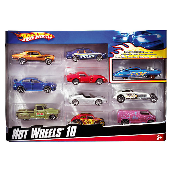В наборе представлено десять различных машинок. Каждая имеет свою марку и тип, окрашены в разные цвета. Колёсики позволяют ездить по любой ровной поверхности, а благодаря инерционному механизму машинку можно запускать по прямой линии, а также использовать для игры с любыми треками. Игрушки отлично детализованы и изготовлены из качественных и безопасных материалов.