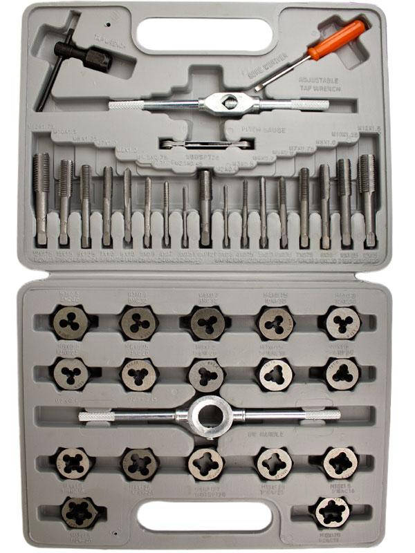 Метчики и плашки: М3 x 0.5 мм, М3 x 0.6 мм, М4 x 0.7 мм, М4 x 0.75 мм, М5 x 0.8 мм, М5 x 0.9 мм, М6 x 0.75 мм, М6 x 1 мм, М7 x 0.75 мм, М7 x 1 мм, М8 x 1 мм, М8 x 1.25 мм, 1/8NPT27, М10 x 1.25 мм, М10 x 1.5 мм, М12 x 1.5 мм, М12 x 1.75 мм.