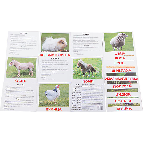 В набор карточек вошли: гусь, утка, коза, овца, пони, осел, кошка, петух, хомяк, индюк, собака, свинья, корова, кролик, курица, лошадь, черепаха, попугай, морская свинка и аквариумная рыбка.