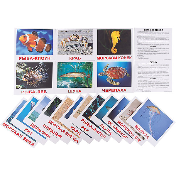 В наборе карточек акула, дельфин, кит, морской конёк, рыба-клоун, рыба-лев, морская змея, медуза, краб, рак, осьминог, морская звезда, скат-хвостокол, рыба-ангел, черепаха, морской ёж, карп, щука, окунь и пиранья.