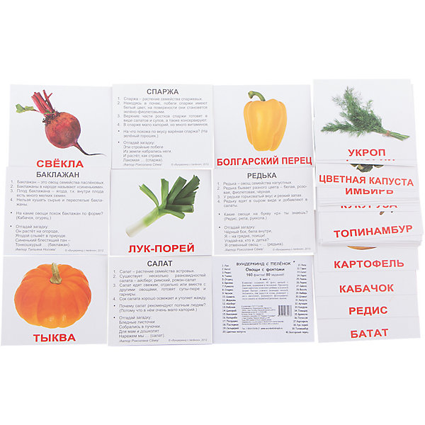 Поучительные карточки развивают память, внимание, усидчивость и другие полезные навыки. Набор подходит для детей от 1 года. В набор карточек входят разные фотографии овощей: Лук, Репа, Батат, Горох, Редис, Салат, Тыква, Укроп, Огурец, Свёкла, Брюква, Имбирь, Ревень, Редька, Спаржа, Фасоль, Чеснок, Шпинат, Щавель, Помидор, Морковь, Капуста, Айсберг, Артишок, Кабачок, Руккола, Цикорий, Брокколи, Баклажан, Патиссон, Кольраби, Кукуруза, Петрушка, Картофель, Пастернак, Лук-порей, Сельдерей, Топинамбур, Цветная капуста, Болгарский перец