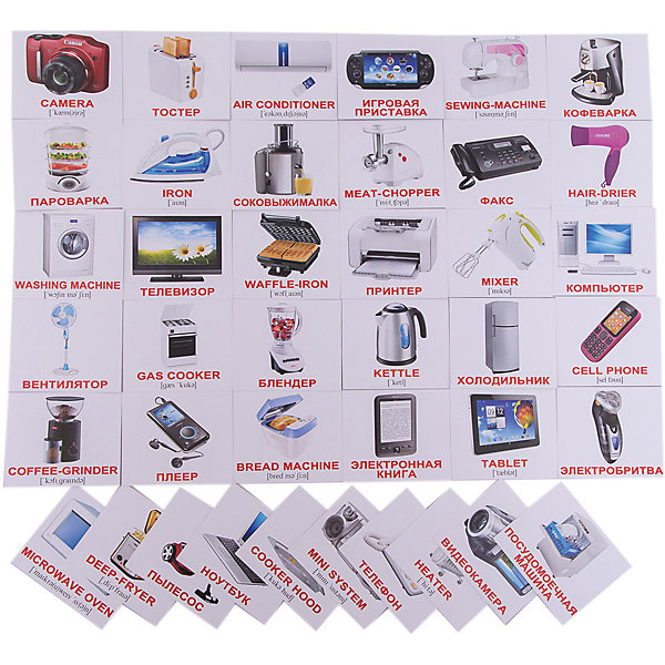 В набор карточек входят слова: 1. Iron - Утюг 2. Mixer - Миксер 3. Player - Плеер 4. Kettle - Чайник 5. Fan - Вентилятор 6. Laptop - Ноутбук 7. Tablet - Планшет 8. Toaster - Тостер 9. Hair-drier - Фен 10. Blender - Блендер 11. Printer - Принтер 12. TV set - Телевизор 13. Fax machine - Факс 14. Steamer - Пароварка 15. Telephone - Телефон 16. Computer - Компьютер 17. Camera - Фотоаппарат 18. Cooker hood - Вытяжка 19. Heater - Обогреватель 20. Juicer - Соковыжималка 21. Camcorder - Видеокамера 22. Deep-fryer - Фритюрница 23. Waffle-iron - Вафельница 24. Meat-chopper - Мясорубка 25. Vacuum cleaner - Пылесос 26. Bread machine - Хлебопечь 27. Gas cooker - Газовая плита 28. Coffee-machine - Кофеварка 29. Coffee-grinder - Кофемолка 30. Refrigerator - Холодильник 31. E-book - Электронная книга 32. Air conditioner - Кондиционер 33. Cell phone - Мобильный телефон 34. Mini system - Музыкальный центр 35. Sewing-machine - Швейная машина 36. Electric shaver - Электробритва 37. Game console - Игровая приставка 38. Microwave oven - Микроволновая печь 39. Washing machine - Стиральная машина 40. Dish-washing machine - Посудомоечная машина