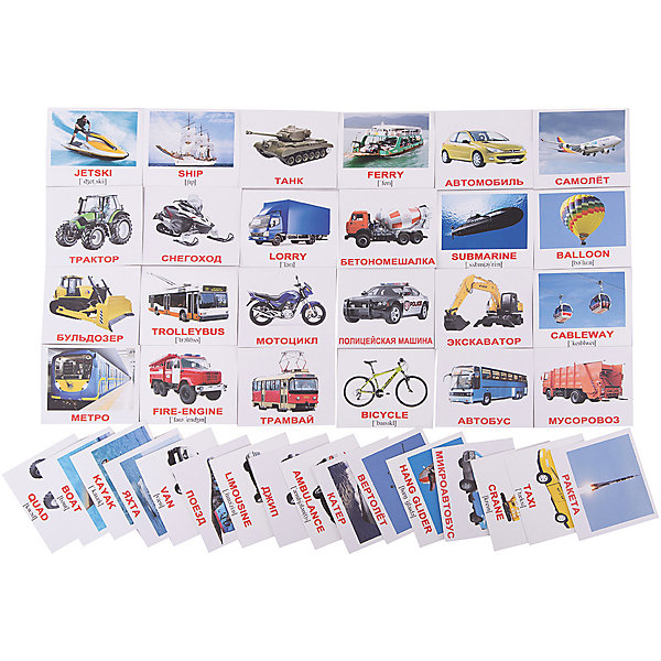 В набор карточек входят слова: 1. Taxi - Такси 2. Jeep - Джип 3. Boat - Лодка 4. Yacht - Яхта 5. Bus - Автобус 6. Launch - Катер 7. Ship - Корабль 8. Ferry - Паром 9. Kayak - Байдарка 10. Car - Автомобиль 11. Snowcar - Снегоход 12. Limousine - Лимузин 13. Bulldozer - Бульдозер 14. Dustcart - Мусоровоз 15. Excavator - Экскаватор 16. Trolleybus - Троллейбус 17. Crane - Подъёмный кран 18. Ambulance - Скораяпомощь 19. Motorcycle - Мотоцикл 20. Quad - Квадроцикл 21. Tank - Танк 22. Plane - Самолёт 23. Van - Фургон 24. Train - Поезд 25. Rocket - Ракета 26. Helicopter - Вертолёт 27. Tram - Трамвай 28. Lorry - Грузовик 29. Tractor - Трактор 30. Jetski - Гидроцикл 31. Bicycle - Велосипед 32. Underground - Метро 33. Hang glider - Дельтаплан 34. Minibus - Микроавтобус 35. Balloon - Воздушный шар 36. Cableway - Канатная дорога 37. Submarine - Подводная лодка 38. Police car - Полицейская машина 39. Fire-engine - Пожарная машина 40. Concrete mixer – Бетономешалка.