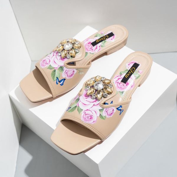 retro thick heel women sandals flower diamond slippers fashionable women's casual beach shoes zapatillas mujer, Black