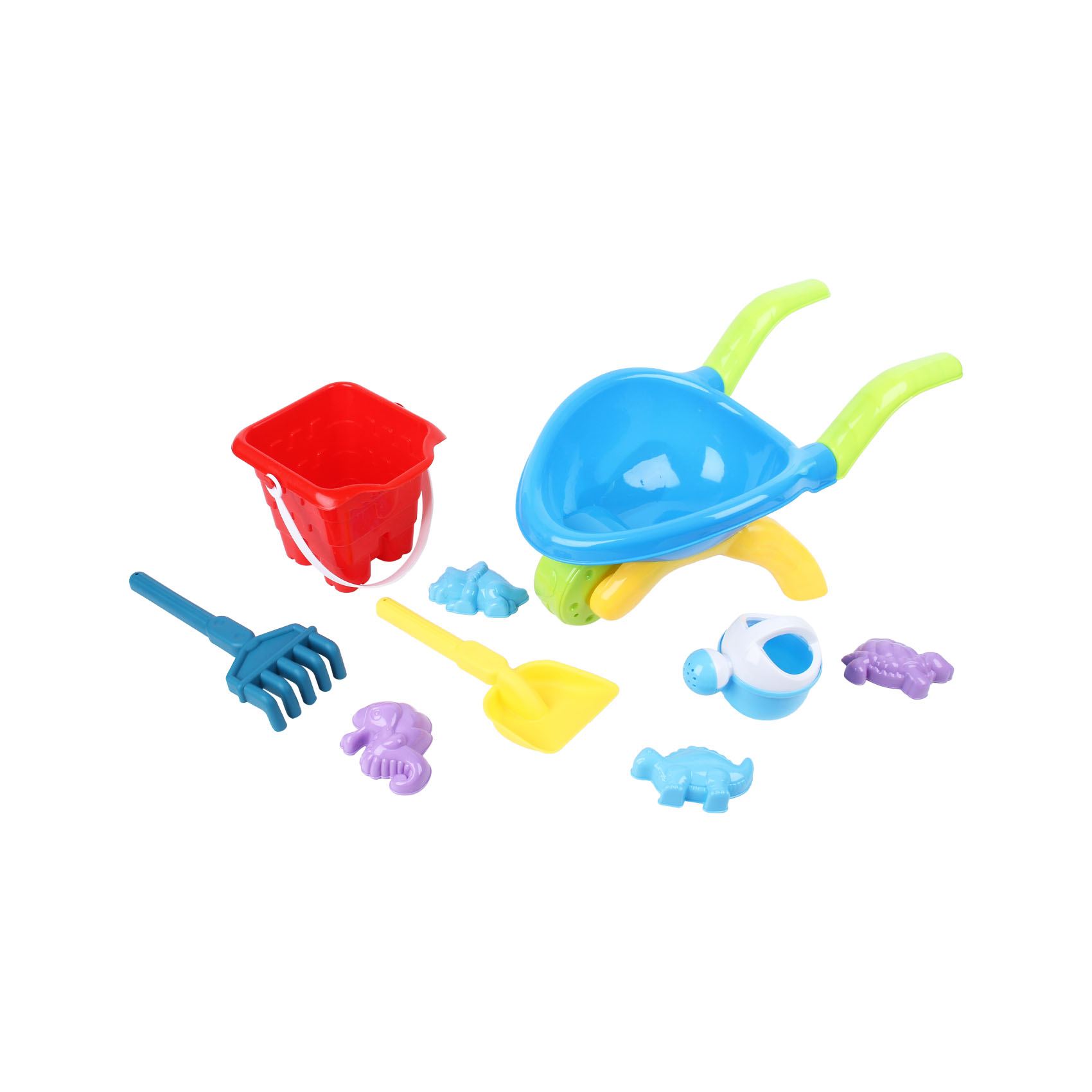 Замечательный песочный набор подарит много радости малышу, сделает его пребывание на пляже или в песочнице детской площадки интересным и полезным.В комплекте – 9 предметов, выполненных из пластмассы. Главный из них – красивая тележка-тачка с треугольным кузовом и широким колесиком. Ее удобно возить по песку, земле, траве. Также в комплекте грабельки, лопатка, высокое ведерко, лейка и игрушки-формочки для лепки фигурок из песка.С таким набором ребенок весело проведет время, получит массу положительных эмоций. Предметы набора – разноцветные, яркие, привлекательные внешне.Набор предназначен для детей от 3-х лет.