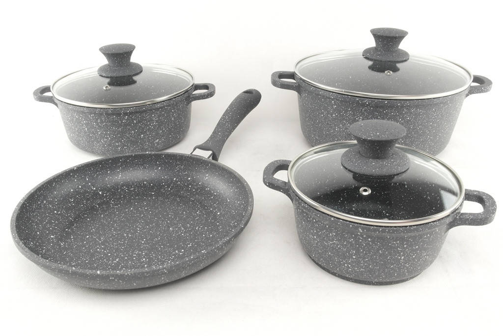 Набор изготовлен из кованого алюминия, имеет толстые стенки и дно, что наилучшим образом подходит для равномерного распределения и сохранения тепла, а также отличается высокой прочностью. Трехслойное мраморное антипригарное покрытие, которое не содержит ПТФЭ. Иными словами, покрытие выполнено только из натуральных материалов и не содержит вредных веществ. Устойчиво к механическим повреждениям и высокой температуре. Благодаря покрытию, посуда имеет высокую прочность и износостойкость. Главная особенность такой посуды - возможность приготовления вкусной и полезной пищи без добавления масла. Мраморное покрытие безопасно для здоровья человека и позволит сохранить в продуктах максимум витаминов. К кастрюлям идут крышки из жаропрочного стекла с отверстием для выхода пара, это способствует уменьшению давления внутри кастрюли. Ручки на крышках изготовлены из бакелита. Посуда пригодна для использования на плитах любого типа, в том числе и индукционных.